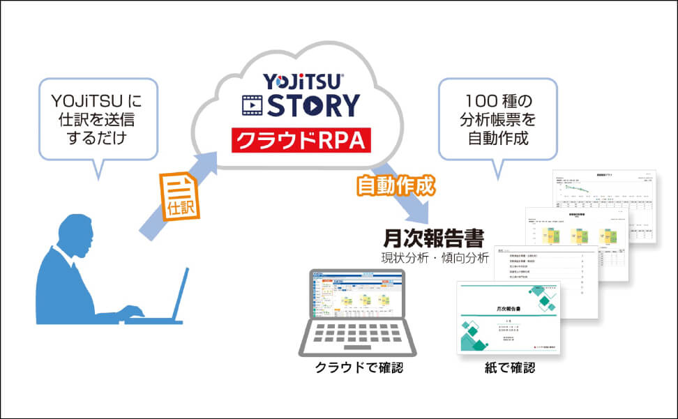 「YOJiTSU」は市販されている全ての会計ソフトのデータをクラウド上に取り込み、目標予算の自動作成や数百パターンの経営分析資料を作成することができるオープンプラットフォームな経営支援システム。